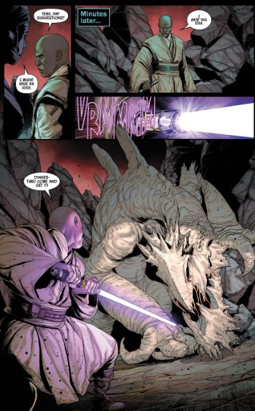 本作初出となるのは第3、第7ストーリー・アークに登場するKaijyuraもまたその一つ。日本語「怪獣」(=”カイジュラ”)に由来すると思しきこのクリーチャーもまた、単に物語に彩りを添える存在であるにとどまらず、『クローン・ウォーズ』におけるジロ・ビースト、または往年の邦訳コミックアンソロジー『スター・ウォーズ テールズ』に収録された「生と死、そしてフォース」を彷彿させる物語の主軸となります。